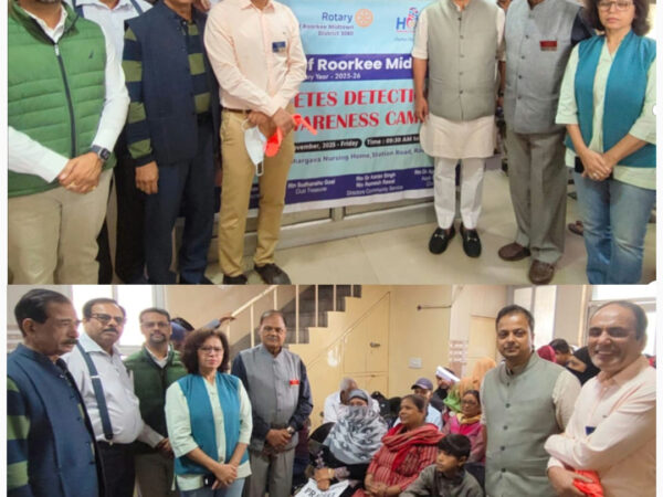 रुड़की।रोटरी क्लब रुड़की मिडटाऊन द्वारा विश्व मधुमेह दिवस पर नि:शुल्क मैडिकल कैम्प का आयोजन भार्गव नर्सिंग होम में किया गया,जिसमें लगभग डेढ़ सौ लोगों की मधुमेह (शूगर) से सम्बन्धित HBA1C,ब्लड