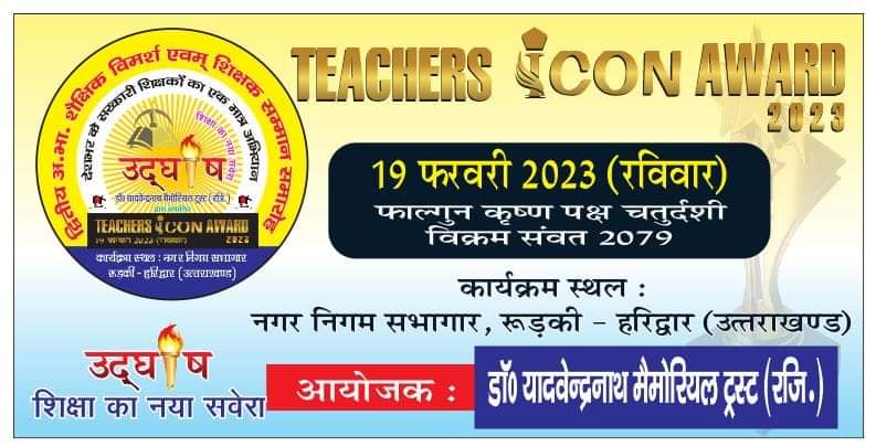 रूडकी। उदघोष शिक्षा का नया सवेरा के तत्वाधान में द्वितीय अ.भा.शैक्षिक विमर्श एवं शिक्षक सम्मान समारोह 19 फरवरी को नगर निगम सभागार रूडकी में मनाया जायेगा। राष्ट्रीय शिक्षा निति-2020: नवाचार