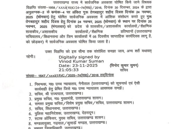 गुरू तेग बहादुर शहीदी दिवस दिनांक 24 नवम्बर, 2025 (सोमवार) हेतु घोषित सार्वजनिक अवकाश में आंशिक संशोधन करते हुए दिनांक 25 नवम्बर, 2025 (मंगलवार) को सार्वजनिक अवकाश घोषित किया गया