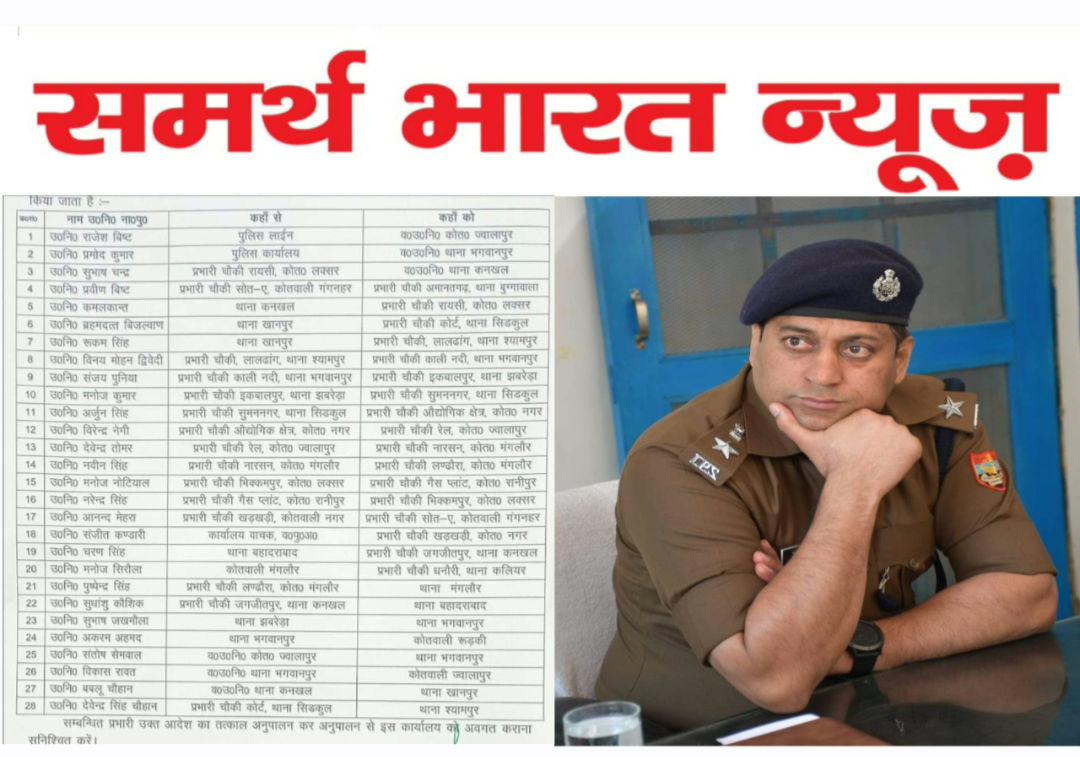 वरिष्ठ पुलिस अधीक्षक हरिद्वार प्रमेंद्र सिंह डोभाल ने एक साथ बहुत सारे बदल दिए। Posted on January 31, 2024 by SAMARTH DD NEWS Share this: Click to share on X (Opens in new window) X Click to share on Facebook (Opens in new window) Facebook Related Post navigation उत्तराखंड में छह आईएएस और 12 पीसीएस अफसरों का तबादले।डॉ. एस.एस. संधु ने मुख्य सचिव श्रीमती रतूड़ी को पदभार सौंपा SAMARTH DD NEWS Leave a Reply Cancel replyYour email address will not be published. Required fields are marked *Comment * Name * Email * Website Save my name, email, and website in this browser for the next time I comment.