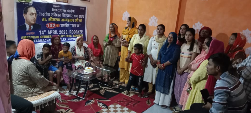 आज दिनांक 14 अप्रैल 2023 को मोहनपुरा बाल्मीकि नगर रुड़की में अंबेडकर जेंडर इक्वलिटी क्लब और सफाई कर्मचारी आंदोलन के बैनर तले नारी मुक्तिदाता, पिछड़ों वंचितों और दलितों के मसीहा बाबा साहेब डॉक्टर भीमराव अंबेडकर जी के 132 वे जन्मदिवस को नारी शक्ति स्वयं सहायता समूह के माध्यम से मनाया गया जिसमें समूह अध्यक्ष पूनम परिवार ने बाबा साहब के बारे में सभी महिलाओं को जानकारी दी और बाबा साहेब की फोटो प्रत्येक घर में हो ऐसा आह्वान किया।