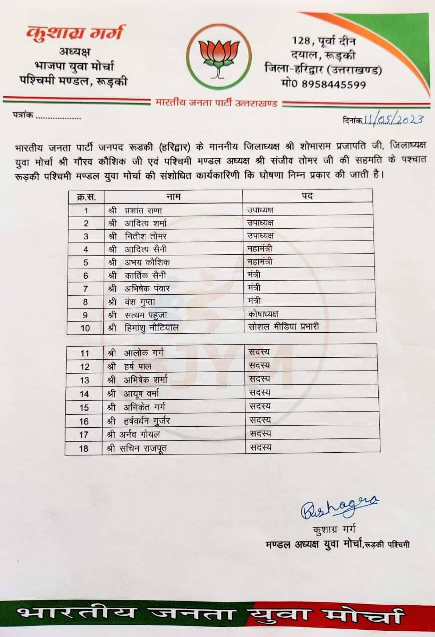 भारतीय जनता युवा मोर्चा कि पश्चिम मंडल की कार्यकारिणी घोषित हुई जिसमें आदित्य सैनी जी को मंडल महामंत्री का दायित्व नियुक्त हुआ।