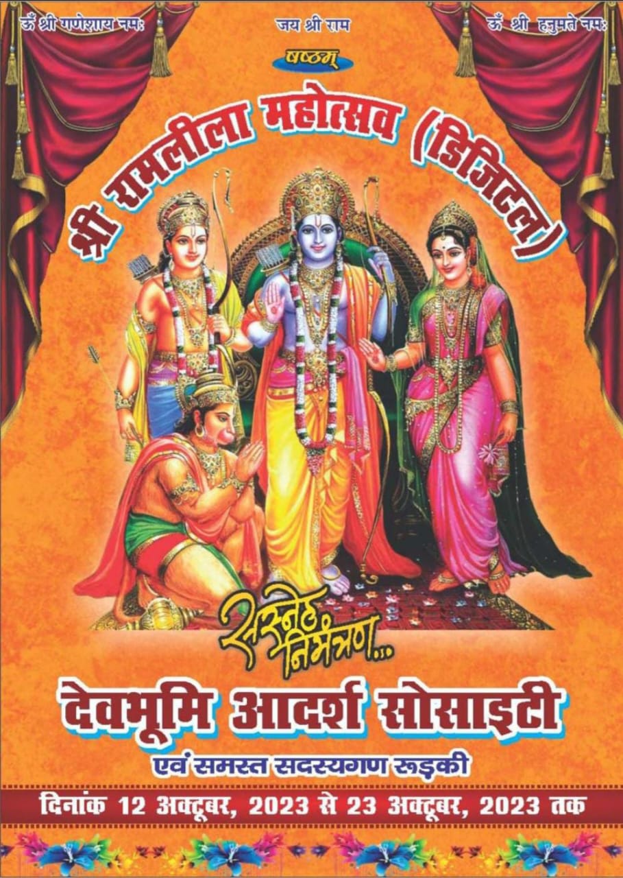 देवभूमि आदर्श सोसाइटी द्वारा छटवा डिजिटल रामलीला के झंडा पूजन कल दिनांक 10 अक्टूबर को दोपहर 12:00 माही पैलेस बैंकेट हॉल आदर्श नगर के पास किया जाएगा समिति संरक्षक सचिन कश्यप ने बताया कि पिछले कई वर्षों से सोसाइटी् द्वारा रामलीला का मंचन आदर्श नगर में किया जा रहा है और इस वर्ष की धूमधाम से आने वाली 12 अक्टूबर को मंचन प्रारंभ किया जाएगा समिति अध्यक्ष आदित्य तोमर ने बताया कि कल झंडा पूजन का कार्यक्रम रहेगा और उसके बाद 15 तारीख को राम बारात का आयोजन किया जाएगा