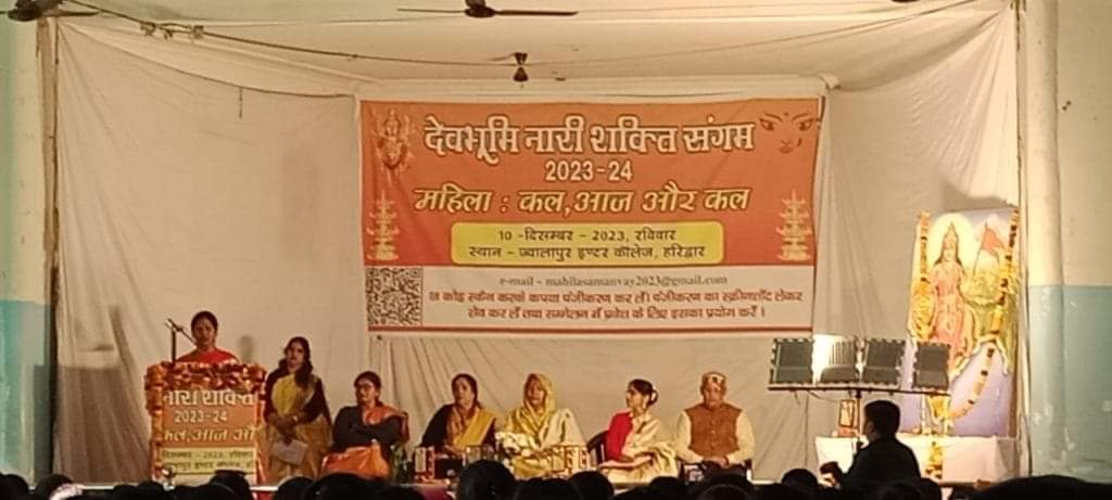 हरिद्वार। देवभूमि नारी शक्ति संगम 2023-24 का भव्य आयोजित आज ज्वालापुर इंटर कालेज परिसर में दो सत्रों में हुआ। प्रथम सत्र में महिला कल आज और कल विषय तथा दूसरे चर्चा सत्र में भारतीय चिंतन में महिला विषय पर प्रश्न एवं करणीय कार्य पर चर्चा हुई। प्रथम सत्र का शुभारंभ गौतमबुद्ध विश्वविद्यालय में विभागाध्यक्ष प्रो.डॉ. वंदना पांडेय ने कहा कि महिला संस्कृति की संवाहक होती है,बालक की प्रथम गुरू होती है। महिला केवल एक शिशु को जन्म नहीं देती, अपितु पूरा राष्ट्र पालती है। उन्होंने कहा कि प्रकृति ने महिला और पुरुष का कोई भेद नहीं किया है। भारतीय संस्कृति में परिवार व्यवस्था, पर्यावरण का चिंतन सशक्त रूप से जुडा है। अनेक कुठाराघातों के बाद भी यदि संस्कृति अक्षुण्ण है तो इसमें महिलाओं का बड़ा योगदान है। उन्होंने ऋग्वेद के एक श्लोक का जिक्र करते हुए कहा कि वेद में भी महिला को साम्राज्ञी बनने का आह्वान किया गया है। उन्होंने कहा महिला तो समर्पण की प्रतिमूर्ति है- चाहे प्रतिमूर्ति हो,या पली अथवा माँ। स्वर्ग का उदाहरण देते हुए उन्होंने कहा कि उर्वशी केवल एक नृत्यांगना नहीं थी,वह यौगिक क्रियाओं, स्थितियों को नृत्य के रूप में स्थापित करने वाली महिला है। भारत की प्राचीन विदूषियों को षडयंत्र के अंतर्गत भुला दिया गया। उन्होंने मुगल काल में जब बहु-बेटियों को को उठाया जाने लगा तब पर्दा प्रथा, सतीप्रथा, बाल कन्या हत्या इत्यादि कुप्रथाएं प्रचलित हुई। अंग्रेजों ने भारतीय संस्कृति को छिन्न भिन्न करने के लिए झूठा इतिहास लिखवाया।