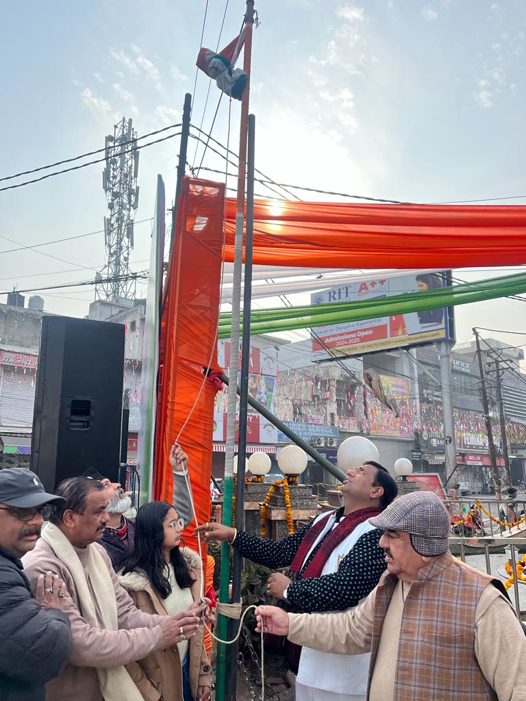 आज 75 वे गणतंत्र दिवस के अवसर पर पार्टी उद्योग व्यापार प्रतिनिधि मंडल के जिला अध्यक्ष एवं जिला महामंत्री द्वारा नगर एवं प्रदेश पदाधिकारी के साथ चंद्रशेखर चौक पर ध्वजारोहण किया गया इस अवसर पर जिला अध्यक्ष सौरभ भूषण शर्मा ने सभी व्यापारी बंधुओ को गणतंत्र दिवस की शुभकामनाएं दी और कहा की हमारा देश आप प्रगति के पथ पर आगे बढ़ रहा है उम्मीद करता हूं अगले वर्ष तक हम विकसित देशों की और एक कदम और बढ़ा चुके होंगे जिला महामंत्री विभोर अग्रवाल ने कहा कि यह वह दिन दूर नहीं जब भारत दुनिया का नेतृत्व करेगा और एक महाशक्ति के रूप में विकसित होकर उभरेगा