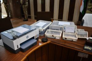 *02 लैपटॉप, 03 आइफोन, 01 एनरॉइड़ 01 जिओ का कीपेड़ फोन, 02 प्रिंटर, नोट छापने व जाली नोट तैयार करने के उपकरण व 02 बाइक बरामद*