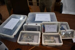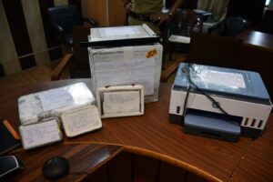2- 02 बाइक(01 प्लसर ,01 ड्यूक), 02 लैपटॉप एचपी कम्पनी, 02 प्रिन्टर इंक जेट एचपी कम्पनी, 04 कटर, 02 केंची ,01 पेपर कटर , 03 कटर , 05 चमकीली ग्रीन टेप, 01 पैन ड्राईव व नोट बनाने का सामान, कटिंग करने के बाद शेष कतरन