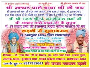 *श्री अलवर वाले बाबा जी का दिनांक 22 अक्टूबर 2024 को रुड़की में शुभ आगमन हो रहा है।*