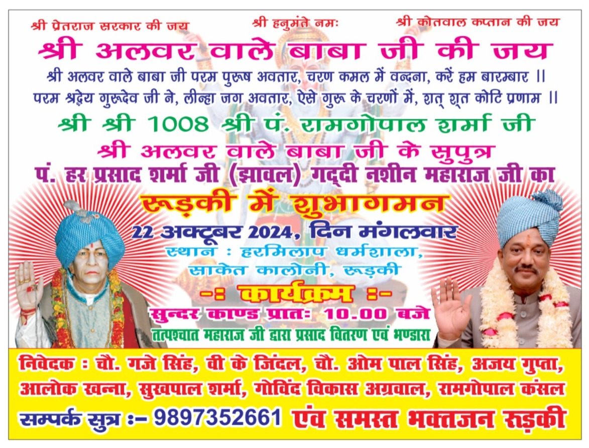 *श्री अलवर वाले बाबा जी का दिनांक 22 अक्टूबर 2024 को रुड़की में शुभ आगमन हो रहा है।*