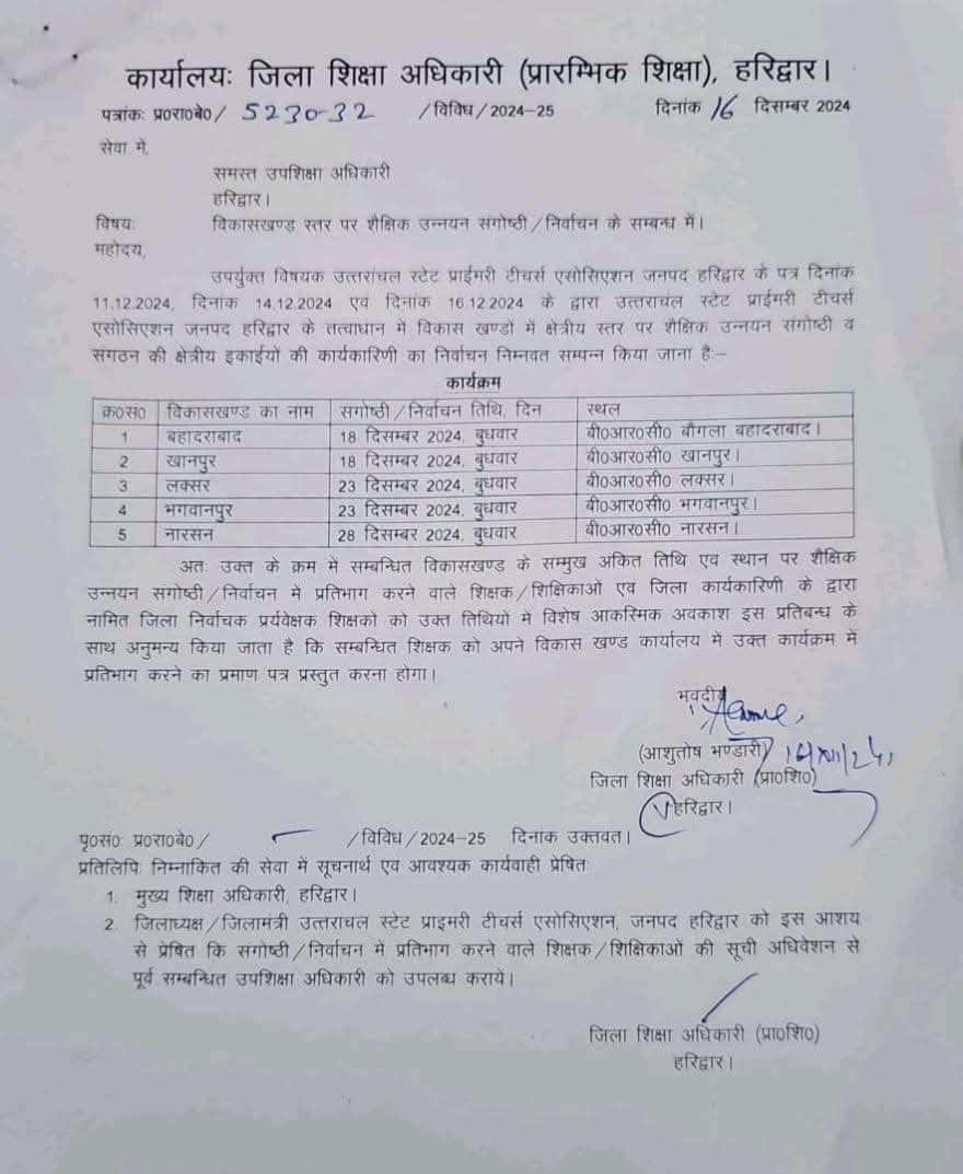 रूड़की। उत्तराचंल स्टेट प्राईमरी टीचर्स एसोसिएशन जनपद हरिद्वार के तत्वाधान में विकास खण्डों में क्षेत्रीय स्तर पर शैक्षिक उन्नयन संगोष्ठी व संगठन की क्षेत्रीय इकाईयों की कार्यकारिणी का निर्वाचन कार्यक्रम घोषित हो गया हैं। संघ के जिला महामंत्री जितेन्द्र कुमार चौधरी ने बताया कि जनपद के पांच ब्लॉक रूड़की को छोड़कर अधिवेशन /निर्वाचन कार्यक्रम घोषित हो गया है जिसके संबंध में विधिवत विभागीय अनुमति भी प्राप्त हो गयी हैं। जिला महामंत्री जितेन्द्र कुमार चौधरी ने बताया कि विकासखण्ड बहादराबाद में संगोष्ठी/ निर्वाचन 18 दिसम्बर को बी०आर०सी० बौगला बहादराबाद, खानपुर विकास खंड भी उसी दिन 18 दिसम्बर 2024, को बी०आर०सी० खानपुर में होगा। लक्सर विकास खंड में 23 दिसम्बर बी०आर०सी० लक्सर तथा भगवानपुर विकास खंड को भी उसी दिन 23 दिसम्बर बी०आर०सी० भगवानपुर व नारसन में 28 दिसम्बर बी०आर०सी० नारसन में आयोजित होगा। शैक्षिक उन्नयन सगोष्ठी / निर्वाचन में प्रतिभाग करने वाले शिक्षक/शिक्षिकाओं एवं जिला कार्यकारिणी के द्वारा नामित जिला निर्वाचक प्रर्यवेक्षक शिक्षकों को उक्त तिथियों में विशेष आकस्मिक अवकाश इस प्रतिबन्ध के साथ अनुमन्य किया गया है कि सम्बन्धित शिक्षक को अपने विकास खण्ड कार्यालय में उक्त कार्यक्रम में प्रतिभाग करने का प्रमाण पत्र प्रस्तुत करना होगा।