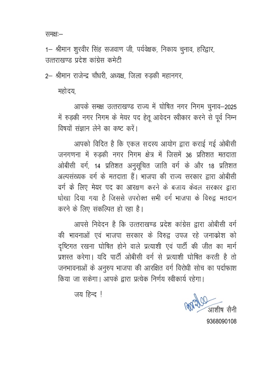 उत्तराखंड प्रदेश कांग्रेस ओबीसी विभाग के पूर्व प्रदेश अध्यक्ष एवं पीसीसी सदस्य आशीष सैनी ने कहा कि उत्तराखण्ड राज्य में घोषित नगर निगम चुनाव-2025 में रुड़की नगर निगम के मेयर पद हेतू आवेदन स्वीकार करने से पूर्व निम्न विषयों संज्ञान लेने का कष्ट करें।