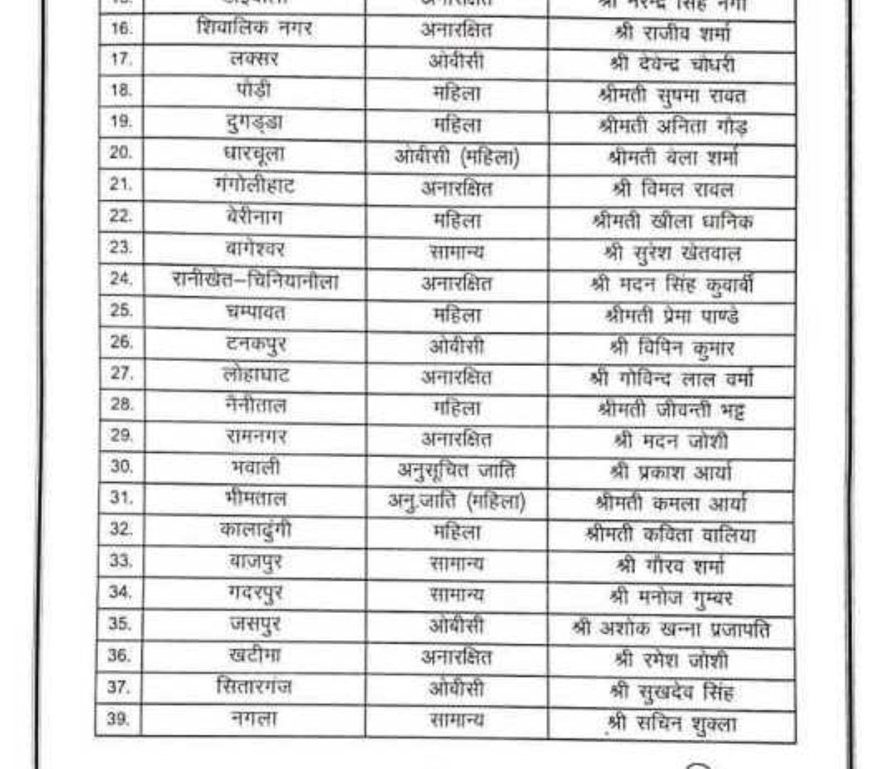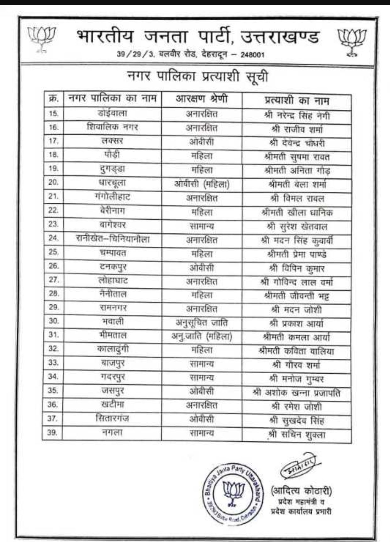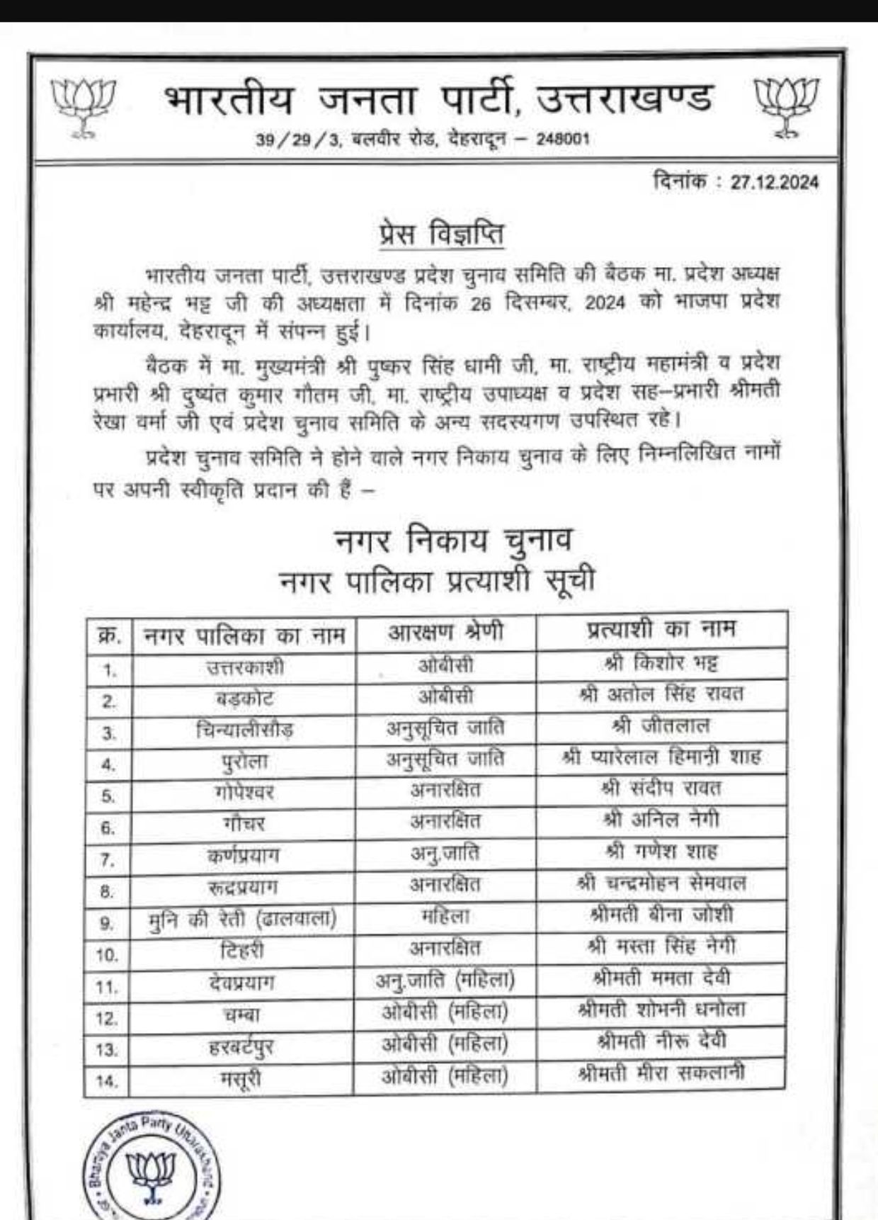 भारतीय जनता पार्टी द्वारा नगर निकाय चुनाव की पहली सूची की गई जारी
