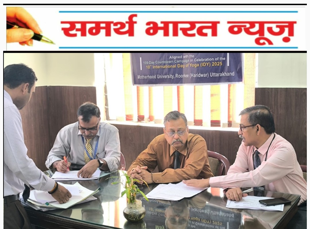 रुड़की। मदरहुड विश्वविद्यालय में 10वें अंतर्राष्ट्रीय योग दिवस एवं 100 दिवसीय काउंटडाउन कार्यक्रम के अंतर्गत दिनांक 02 मई 2025 को योग चैपालः निबन्ध प्रतियोगिता का आयोजन किया गया, जिसमें विश्वविद्यालय के सभी 11 विभागों से कुल 153 छात्र-छात्राओं ने योग विषयों से सम्बन्धित अपने-अपने निबन्धों के साथ भाग लिया। यह प्रतियोगिता एक मई 2025 को आयोजित हुई थी जिसका परिणाम 02 मई 2025 को योग चैपाल के मंच से निर्णायक मण्डल द्वारा किया गया।