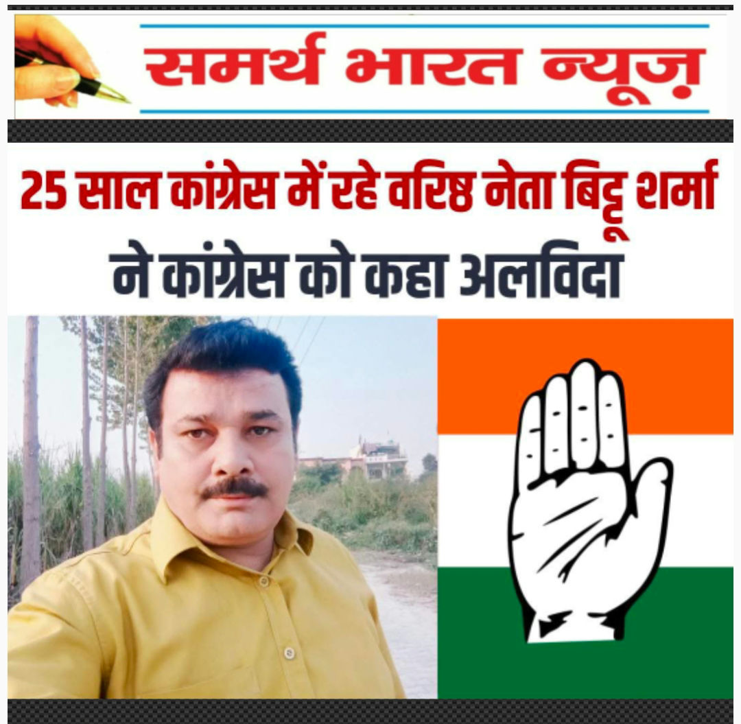 रुड़की – 25 साल कांग्रेस के समर्पित हिस्सा रहे वरिष्ठ नेता बिट्टू शर्मा में कांग्रेस को कहा अलविदा , किसान यूनियन में होंगे शामिल