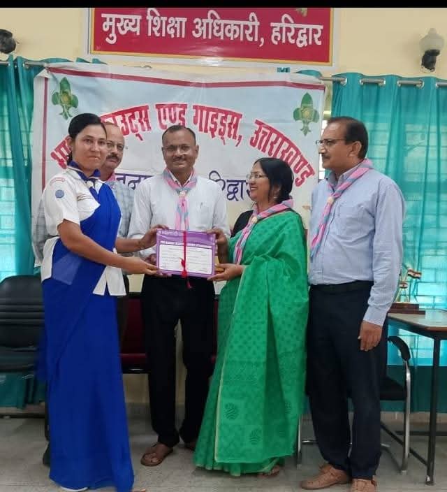 मुख्य शिक्षा अधिकारी कार्यालय हरिद्वार में आज भारत स्काउट्स एंड गाइडस के जनपद स्तरीय तृतीय सोपान में प्रतिभाग कर,सफलता प्राप्त करने वाले बच्चों को तृतीय सोपान प्रमाण पत्रों का वितरण कार्यक्रम आयोजित किया गया। कार्यक्रम में मुख्य अतिथि के रूप में उपस्थित अपर शिक्षा निदेशक,माध्यमिक गढ़वाल मंडल पौड़ी श्रीमती कंचन देवरानी उपस्थिति रही। अपने संबोधन में उन्होंने कहा की स्काउटिंग गाइडिंग का मूल उद्देश्य ही सेवा भाव है इस संस्था में जुड़ने से शिक्षकों एवं बच्चों का सर्वांगीण विकास होता है इसलिए प्रदेश के सभी विद्यालयों में काउंटिंग गाइडिंग की गतिविधियों को अनिवार्य किया गया है। इस अवसर पर मुख्य शिक्षा अधिकारी हरिद्वार श्री कमलेश कुमार गुप्ता ने अपने संबोधन में कहा कि हरिद्वार जनपद में स्काउटिंग गाइडिंग की गतिविधि प्रत्येक विद्यालय में संचालित हो रही है जिससे बच्चों में अनुशासन के साथ-साथ संस्कारी शिक्षा को भी बढ़ावा मिल रहा है। जिला शिक्षा अधिकारी माध्यमिक श्री आशुतोष भंडारी ने अपने संबोधन में कहा की स्काउटिंग गाइडिंग की गतिविधियों में शामिल होने से बच्चों में स्वावलंबन की भावना का विकास होता है। इस अवसर पर संस्था के जिला सचिव राजेश सैनी द्वारा अवगत कराया गया कि जनपद स्तरीय शिविर को जनपद के विभिन्न 14 विद्यालयों में आयोजित किया गया। जिसमें लगभग 1400 बच्चों ने प्रतिभाग कर, सफलता प्राप्त की। आज उन सभी बच्चों के शिक्षकों को उनके प्रमाण पत्र का वितरण विद्यालयवार किया गया। जिला संगठन आयुक्त पुरवेंद्र कुमार