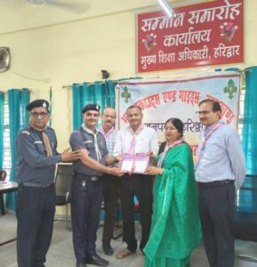हरिद्वार। स्काउट गाइड का मूल उद्देश्य ही सेवा भाव है। इस संस्था से जुड़ने पर बच्चों का सर्वांगीण विकास होता है, इसीलिए प्रदेश के प्रत्येक विद्यालय में स्काउटिंग /गाइडिंग को अनिवार्य किया गया है यह उदगार आज मुख्य शिक्षा अधिकारी कार्यालय हरिद्वार में आयोजित जनपद के तृतीय सोपान प्रमाण पत्र वितरण कार्यक्रम में मुख्य अतिथि के रूप में बोलते हुए अपर शिक्षा निदेशक,माध्यमिक गढ़वाल मंडल पौड़ी कंचन देवराडी द्वारा व्यक्त किए गए।