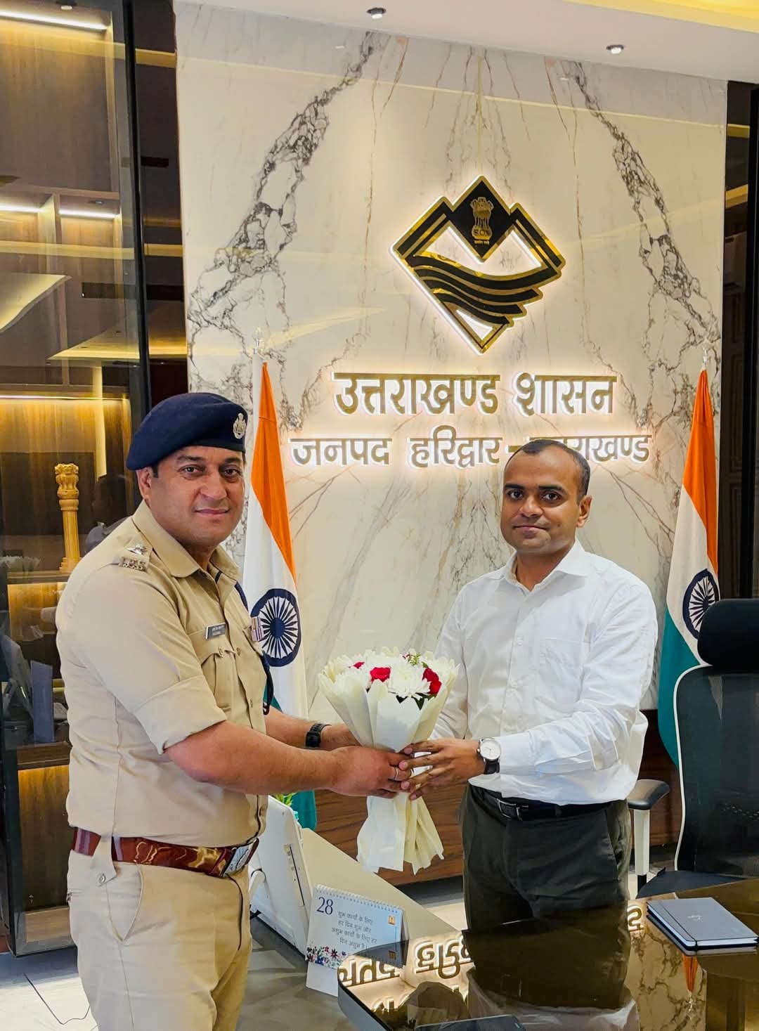 नवनियुक्त जिलाधिकारी मयूर दीक्षित से एसएसपी हरिद्वार प्रमेन्द्र सिंह डोबाल ने कलेक्ट्रेट कार्यालय रोशनाबाद में की औपचारिक मुलाकात,पुष्प गुच्छ भेंट कर किया स्वागत।
