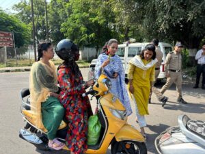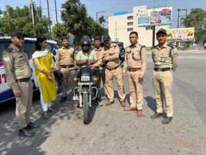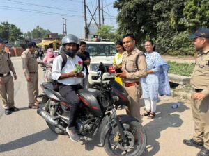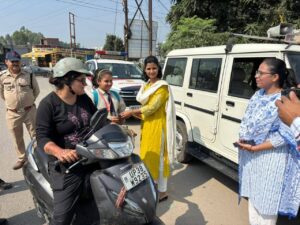 हरिद्वार। सहायक संभागीय परिवहन अधिकारी निखिल शर्मा ने अवगत कराया है कि परिवहन विभाग द्वारा आज हेलमेट के प्रति सिडकुल क्षेत्र में प्रवर्तन/जागरूकता अभियान चलाया गया। उन्होंने अवगत कराया कि बिना हेलमेट के पाए गए 100 दुपहिया वाहनों का चालान किया गया तथा 15 से अधिक दुपहिया वाहन जिनके पास लाइंसेंस एवं हेलमेट नहीं थे उन वाहनों को सीज किया गया। उन्होंने यह भी अवगत कराया कि हेलमेट लगाने वाले लोगों को परिवहन टीम द्वारा फूल तथा चॉकलेट देकर प्रोत्साहित किया। इस अभियान में सहायक परिवहन अधिकारी श्रीमती नेहा झा,परिवहन कर अधिकारी अरुणा सैनी,सहायक परिवहन उप निरीक्षक अश्वनी कुमार,सहायक परिवहन निरीक्षक सुरवीर कण्डवाल शामिल रहे।