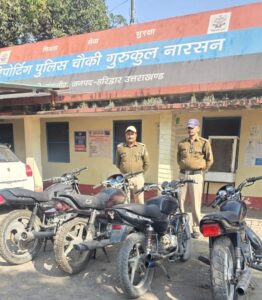 उच्चाधिकारियों के निर्देशानुसार स्कूल कॉलेज के बाहर अनावश्यक घूमते युवकों की चेकिंग/सत्यापन अभियान के क्रम में मंगलौर पुलिस चौकी प्रभारी गुरुकुल नारसन द्वारा पुलिस टीम ने गश्त और वाहन जांच के दौरान चार मोटरसाइकिलें जब्त की हैं,जो कि बिना नंबर प्लेट: जब्त की गई सभी गाड़ियों पर वैध पंजीकरण प्लेट (नंबर प्लेट) नहीं लगी हुई थी, जो मोटर वाहन अधिनियम का स्पष्ट उल्लंघन है। इसके साथ ही कई वाहनों में अवैध रूप से मॉडिफाइड साइलेंसर लगाए गए थे, जो ध्वनि प्रदूषण मानकों का उल्लंघन करते हैं । पुलिस के अनुसार अक्सर आपराधिक गतिविधियों में वाहनों की पहचान छिपाने के लिए बिना नंबर प्लेट वाहन उपयोग किए जाते हैं। पुलिस ने जब्त की गई मोटरसाइकिलों के खिलाफ मोटर वाहन अधिनियम की संबंधित धाराओं में सीज कर दिया है, कार्यवाही आगे भी जारी रहेगी। वहीं पुलिस विभाग ने आम जनता से अपील की कि वे अपने वाहनों पर वैध नंबर प्लेट का उपयोग करें और ध्वनि प्रदूषण फैलाने वाले मॉडिफाइड उपकरणों का उपयोग करने से बचें।