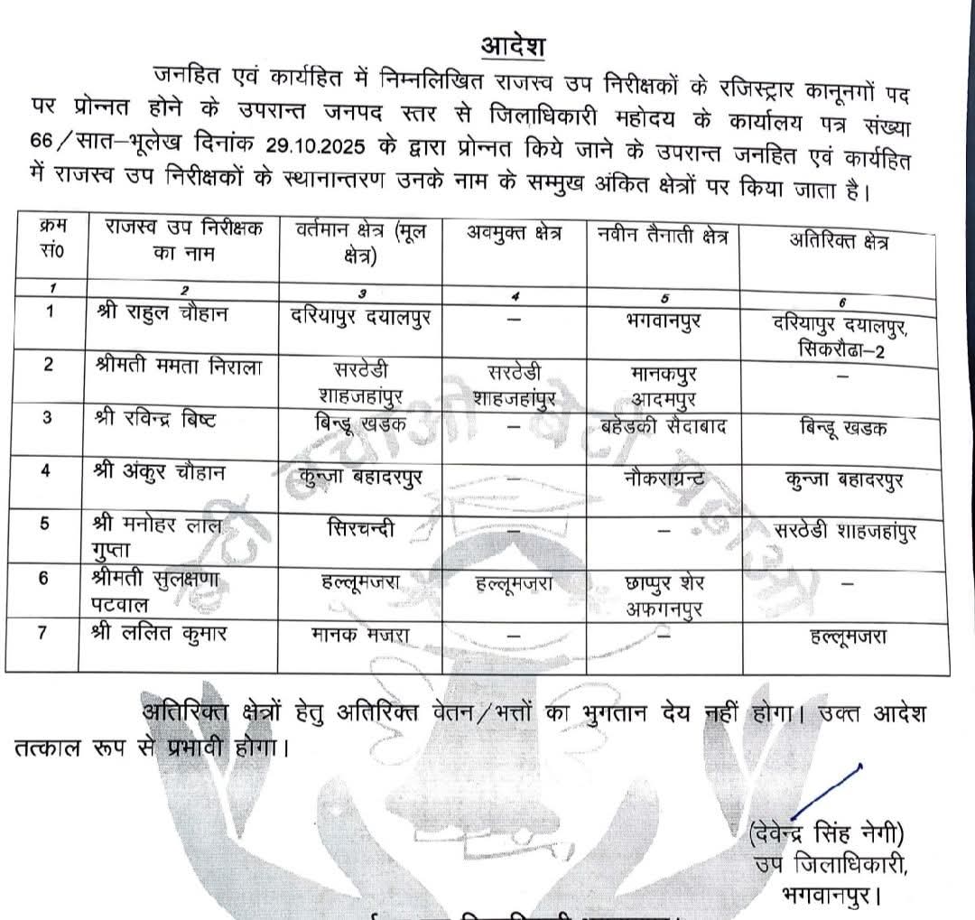 उप जिलाधिकारी भगवानपुर देवेंद्र सिंह नेगी ने सात लेखपालों के कार्य क्षेत्र बदले। Posted on November 11, 2025 by SAMARTH DD NEWS उप जिलाधिकारी भगवानपुर देवेंद्र सिंह नेगी ने सात लेखपालों के कार्य क्षेत्र बदले। Share this: Click to share on X (Opens in new window) X Click to share on Facebook (Opens in new window) Facebook Related Post navigation परिसंपत्तियों के क्रय- विक्रय का वर्चुअल रजिस्ट्रेशन होने से व्यवस्था में पारदर्शिता आएगी, समय की बचत होगी और परिसंपत्ति के क्रय- विक्रय से जुड़े विवाद थमेंगे: मुख्य सचिव मुख्य सचिव आनंद बर्धन की अध्यक्षता में परिसंपत्तियों यथा भूमि के क्रय – विक्रय का वर्चुअल रजिस्ट्रेशन करने के संबंध में समीक्षा बैठक आयोजित की गई मुख्य सचिव ने संबंधित अधिकारियों से वर्चुअल रजिस्ट्रेशन के कार्यों की प्रगति का स्टेटस लेते हुए निर्धारित टाइमलाइन में इसका क्रियान्वयन को सुनिश्चित करने के निर्देश दिएजिलाधिकारी मयूर दीक्षित ने सीवर लाइन कार्यों का निरीक्षण किया SAMARTH DD NEWS Leave a Reply Cancel replyYour email address will not be published. Required fields are marked *Comment * Name * Email * Website Save my name, email, and website in this browser for the next time I comment.