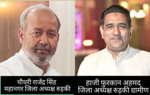 रुड़की में पुनः एक बार फिर कांग्रेस जिला अध्यक्ष पद की जिम्मेदारी राजेंद्र चौधरी एडवोकेट को सौंपी गई। विधायक फुरकान अहमद को रुड़की ग्रामीण कांग्रेस का जिला अध्यक्ष बनाया गया है।