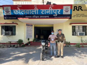 रानीपुर पुलिस टीमों द्वारा सुरागरसी एवं विभिन्न CCTV फुटेज का गहन अध्ययन किया गया। साथ ही पूर्व में ऐसी घटनाओं में लिप्त अपराधियों का डाटा खंगाला गया। इसी आधार पर जांच आगे बढ़ाई गई। चौकी प्रभारी गैस प्लांट उ0नि0 विकास रावत के नेतृत्व में पुलिस टीम ने मुखबिर की सूचना पर आर्मी ग्राउंड शिवालिक नगर के कच्चे रास्ते से मो0सा0 TVS RADEON रजि0 UP 19 P 5569 सवार आरोपी अब्दुल गफ्फार पुत्र शेर मोहम्मद निवासी ग्राम शाहीपुर, थाना किठौर, जिला मेरठ (उम्र 26 वर्ष) को हिरासत में लिया। आरोपी के कब्जे से दो अदद पीली धातु के कंगन बरामद किए गए।