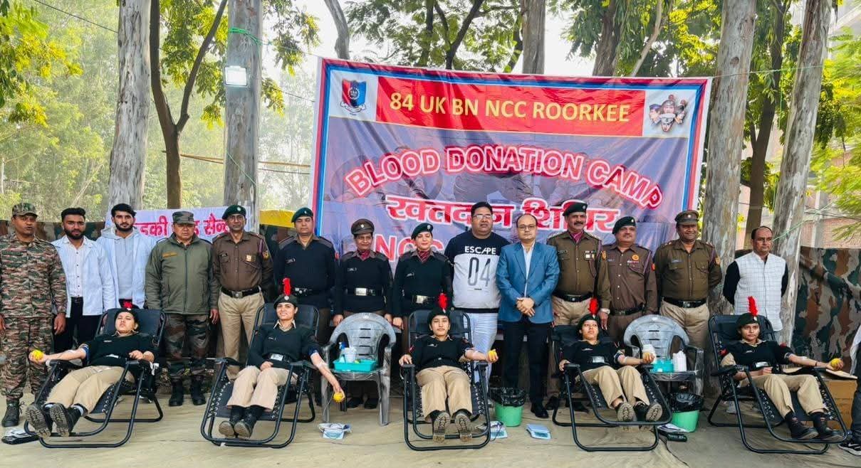 रुड़की। 84 उत्तराखंड बटालियन एनसीसी, रुड़की के तत्वाधान में क्वांटम विश्वविद्यालय, मंडावर रुड़की में दिनांक 18 नवंबर 2025 से आयोजित शिविर के छठे दिन 78वे एनसीसी स्थापना दिवस के अवसर पर विशाल रक्तदान शिविर का आयोजन किया गया जिसमें एनसीसी कैडेट्स, स्टाफ क्वांटम विश्वाविद्यालय के छात्र, छात्राओं द्वारा 195 यूनिट रक्तदान किया गया जो खबर लिखे जाने तक भी जरी था । कर्नल अमन कुमार सिंह, कैम्प कमांडेंट द्वारा एनसीसी कैडेट्स को रक्तदान से होने वाले लाभ के बारे में बताया गया जिसमें किसी व्यक्ति की जान बचाना, हृदय रोग का जोखिम कम करना, नई रक्त कोशिकाओं के निर्माण को बढ़ावा देना और कैलोरी बर्न करना शामिल है के बारे में बताया गया । रक्तदान के अवसर पर क्वांटम विश्वविद्यालय के कुलसचिव डॉ अमित दीक्षित द्वारा रक्तदान हेतु आए एनसीसी कैडेट्स व छात्र-छात्राओं को बताया गया की रक्तदान करने से शरीर में आईरन का संतुलन बना रहता है जिससे हृदय रोग का खतरा कम हो जाता है एक बार रक्तदान करने से 650 कैलोरी तक बर्न हो सकती है क्योंकी शरीर नए रक्त कोशिकाओं की निर्माण के लिए ऊर्जा खर्च करता है व रक्त दन करने से हमें मुफ्त स्वास्थ्य जांच का लाभ भी मिलता है जिसमें कैंसर जैसी गंभीर बीमारियों का पता चलता है और खतरा कम हो सकता है । रक्तदान शिविर के आयोजन में वाहिनी के प्रशिक्षण अधीक्षक रवि कपूर का विशेष योगदन रहा । इस अवसर पर डिप्टी कैम्प कमांडएंट मेजर (डॉ) गौतम वीर, कैप्टन सुशील कुमार आर्य, सूबेदार मेजर अमर सिंह रावत, लेफ्टिनेंट रत्नेश कुमार, सूबेदार पंकज पाल, बीएचएम केशवानंद, हवलदार पूर्ण सिंह, ईएसएम सतेंद्र सिंह, फर्स्ट ऑफिसर कमल मिश्रा, सेकंड ऑफिसर सुशील कुमार, सेकंड ऑफिसर रेणु देवी लेफ्टिनेंट अंजना गुसाई, केयरटेकर पंकज कुमार, केयरटेकर वंदना चौहान, केयरटेकर प्रियंका प्रजापति व रक्तदान करने वाले कैडेट्स रोहित, फाल्गुनी चुटानी, स्नेहा आचार्य, ले सुमित चौहान, एसयूओ श्रुति, यूओ अनंत चौहान, वंश प्रजापति आदि विशेष रूप से उपस्थित रहे ।