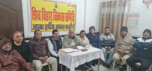 हरिद्वार। आज शिव विहार विकास समिति आर्य नगर ज्वालापुर की बैठक समिती कार्यालय में हुई । बैठक में कालोनी के ज्वलंत मुद्दों पर चर्चा की गयी । बैठक में हरिद्वार की मेयर तथा स्थानीय पार्षद द्वारा कालोनी में अभी तक पार्क का निर्माण न करायें जाने को लेकर रोष प्रकट किया गया । समिति के संरक्षक डॉ के पी एस चौहान ने कहा कि एक वर्ष पहले शिव विहार स्थित शिव मन्दिर में आयोजित मेयर के अभिनन्दन समारोह में पार्क का निर्माण कराने कराने के लिए पार्षद पिंकी चौधरी तथा मेयर किरण जैसल को ज्ञापन पत्र दिया गया था ।