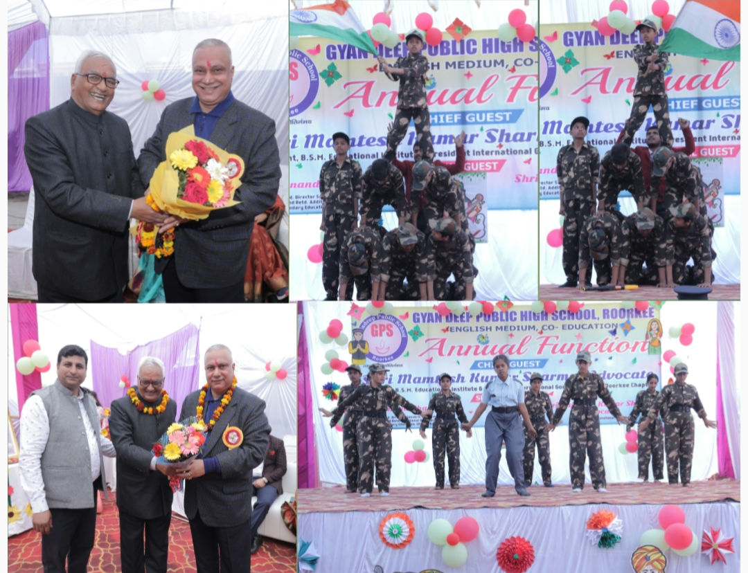 कल दिनांक 16 फरवरी 2026 को पनियाला रोड ,शिवपुरम रुड़की स्थित ज्ञानदीप पब्लिक हाई स्कूल में विद्यालय का वार्षिकोत्सव बड़े धूमधाम के साथ मनाया गया ।कार्यक्रम के मुख्य अतिथि श्री ममतेश कुमार शर्मा एडवोकेट ,(अध्यक्ष बी.एस.एम शिक्षण संस्थान विशिष्ट अतिथि श्री रजनीश कुमार शर्मा एडवोकेट सचिव बीएम शिक्षण संस्थान तथा डॉक्टर आनंद भारद्वाज (पूर्व संस्कृत शिक्षा निदेशक एवं पूर्व अपर शिक्षा निदेशक माध्यमिक शिक्षा उत्तराखंड) रहे।अन्य अतिथियों में श्री हर्ष तिवारी एवं श्रीमती वंदना तिवारी (एम .डी. कोटैक हेल्थ केयर), एडवोकेट भानु प्रताप गौतम ,श्रीमती सुनीता शर्मा एवं श्रीमती रेखा शर्मा, डॉ. ममता जोशी प्रधानाचार्य (बीएसएम बी. एड. कॉलेज) , श्री ब्रजमोहन रहे।