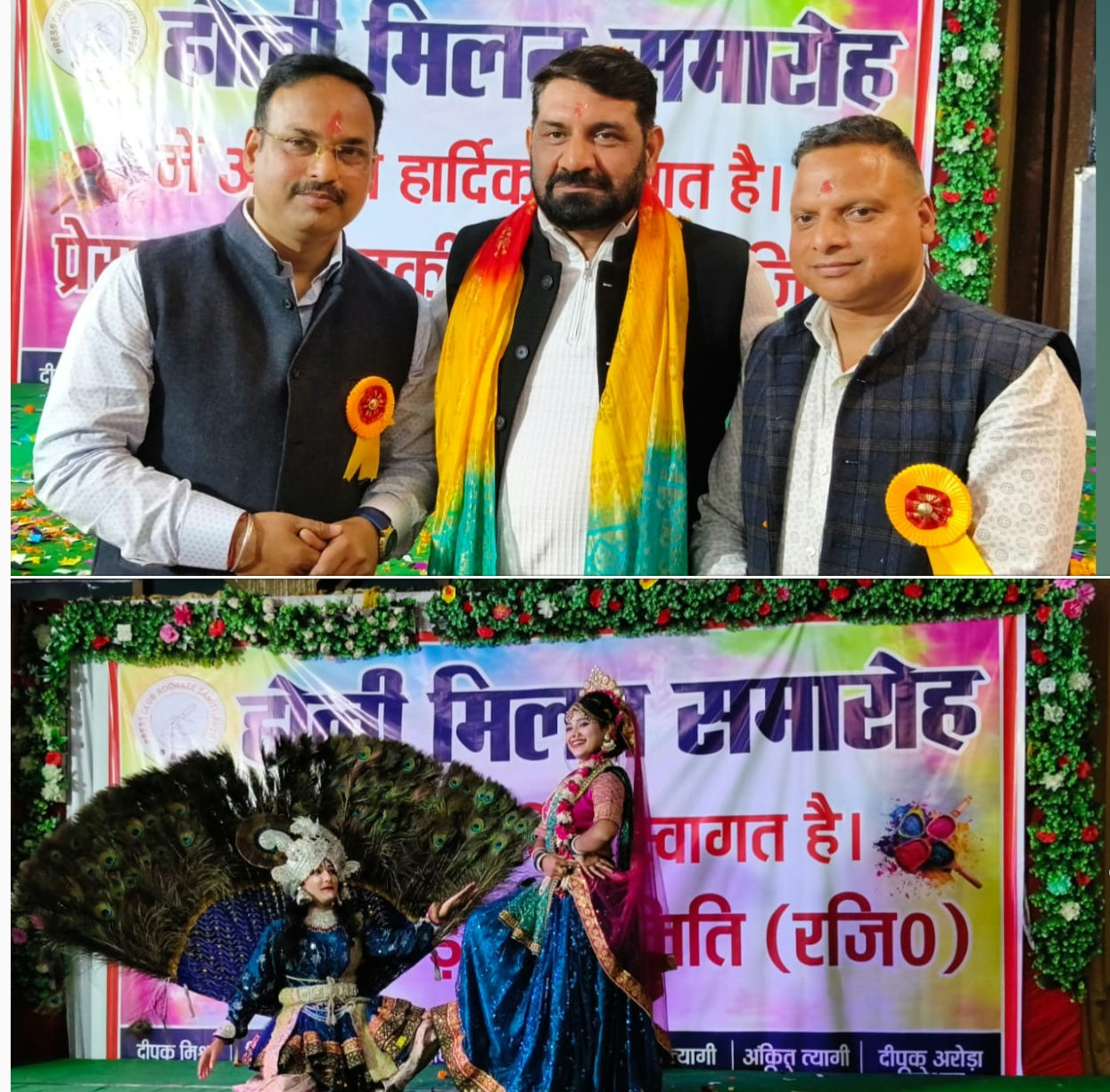 रुड़की।प्रेस क्लब रुड़की समिति (रजि०) के होली मिलन समारोह में प्यार के रंग बरसे।पत्रकारों,नेताओं और अधिकारियों ने एक-दूसरे पर फूल बरसाकर एकता और भाईचारे की होली खेली।इस दौरान राधा-कृष्ण के रूप में कलाकारों द्वारा दी गई प्रस्तुति ने सबका मन मोह लिया।नन्हें कलाकारों की प्रस्तुति ने भी जमकर तालियां बटोरी।देर रात तक प्रेस क्लब का होली मिलन समारोह प्रेम और भाईचारे की खुशबू बिखेरता रहा।कार्यक्रम में बतौर अतिथि पहुंची समाजसेवी पूजा गुप्ता,विशिष्ट अतिथि एसपी देहात शेखर चंद सुयाल,पूर्व मेयर गौरव गोयल,भाजपा जिला महामंत्री अक्षय प्रताप सिंह,इंटक जिलाध्यक्ष उदय सिंह पुंडीर तथा प्रेस क्लब अध्यक्ष दीपक मिश्रा व उनकी पत्नी समाजसेविका ज्योति मिश्रा ने संयुक्त रूप से दीप प्रज्ज्वलित कर कार्यक्रम की शुरुआत की।इस दौरान समाजसेवी पूजा गुप्ता ने कहा कि होली रंगों का त्यौहार है और ये रंग जीवन में खुशबू भरने का काम करते हैं,इसलिए हम सभी को तेज रंगों से बचना चाहिए।आपसी सदभाव का परिचय देते हुए प्रेम की होली खेलनी चाहिए।बिना दूसरे की मर्जी के उसके ऊपर रंग नहीं डालना चाहिए।प्रेस क्लब ने होली मिलन समारोह के जरिए जो प्रेम और भाईचारे का संदेश दिया है वह सभी के लिए एक अच्छा संदेश है।दर्जाप्राप्त राज्य मंत्री श्यामवीर सैनी व शोभाराम प्रजापति ने कहा कि होली और ईद मिलन जैसे समारोह समाज में एकता और भाईचारे का पैगाम देते हैं।ऐसे कार्यक्रमों में उनका सहयोग हमेशा बना रहेगा।विधायक वीरेंद्र जाती,कांग्रेस प्रदेश महामंत्री सचिन गुप्ता,राज्य आंदोलनकारी समाजसेवी भावना पांडे,भाजपा जिला उपाध्यक्ष संजय अरोड़ा,व्यापार मंडल अध्यक्ष अरविंद कश्यप ने कहा कि होली मिलन समारोह के माध्यम से प्रेस क्लब रुड़की ने समाज में प्रेम और भाईचारे का संदेश दिया है।ढंडेरा नगर पंचायत अध्यक्ष सतीश नेगी,भाजपा नेता रचित अग्रवाल, भाजपा नेत्री रश्मि चौधरी,समाजसेवी प्रमोद जौहर,डॉ०मेघराज सिंह,सौरभ सिंघल,शिक्षक नेता प्रदीप त्यागी,वरिष्ठ भाजपा नेता एडवोकेट नवीन कुमार जैन,प्रणय प्रताप सिंह,डॉ०सौरभ गुप्ता,अभिषेक चंद्रा, समाजसेविका नीलम चौधरी ने भी समारोह को सराहनीय बताते हुए प्रेम और भाईचारे से होली खेलने का संदेश दिया।प्रेस क्लब अध्यक्ष दीपक मिश्रा ने समारोह में पहुंचे सभी अतिथियों का पटका पहनाकर और बुके देकर स्वागत किया।कार्यक्रम का संचालन सुभाष सक्सेना एवं दीपक शर्मा ने संयुक्त रूप से किया।इस अवसर पर विकास त्यागी,अवनीश शर्मा,नरेश यादव, प्रदीप गोयल,संदीप गोयल,केतन भारद्वाज,प्रेस क्लब उपाध्यक्ष रियाज कुरैशी,महासचिव अश्विनी उपाध्याय,कोषाध्यक्ष विनित त्यागी,सचिव नितिन कश्यप,डायरेक्टर दीपक अरोड़ा,अंकित त्