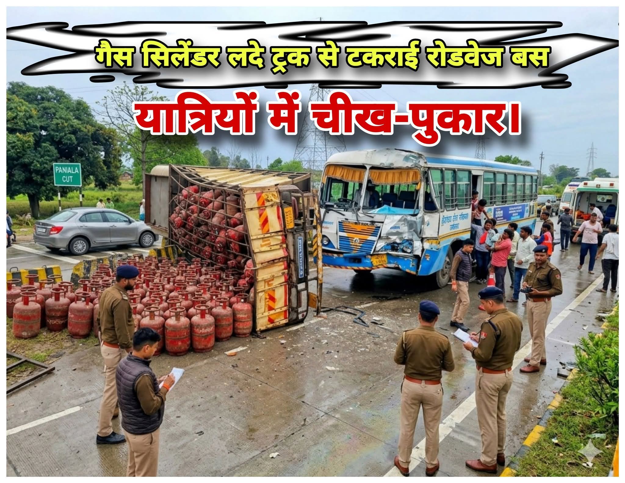 पनियाला कट के पास रविवार सुबह एक बड़ा सड़क हादसा हो गया। गैस सिलेंडरों से भरा एक ट्रक अचानक अनियंत्रित होकर पलट गया और सामने से आ रही रोडवेज बस से उसकी जोरदार टक्कर हो गई। हादसे में बस में सवार कई यात्री घायल हो गए, जबकि सड़क पर कुछ देर के लिए अफरा-तफरी का माहौल बन गया।