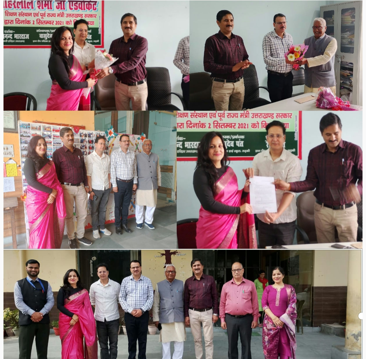 इस अवसर पर डॉ. बी.सी. चौबे (सहायक निदेशक – विधि, उच्च शिक्षा निदेशालय, उत्तराखंड सरकार), प्रो. गोविंद पाठक (सहायक निदेशक, उच्च शिक्षा निदेशालय, हल्द्वानी, उत्तराखंड) और प्रो. डॉ. प्रमोद कुमार डोबरियाल (सहायक निदेशक, उच्च शिक्षा, उत्तराखंड) ने विद्यालय में आकर विद्यालय प्रबंधक श्री वासुदेव पंत एवं प्रधानाचार्या श्रीमती रेखा पंत से भेंट की तथा उन्हें स्वयं विद्यालय इंटरमीडिएट मान्यता पत्र सौंपा और इस उपलब्धि पर समस्त विद्यालय परिवार को शुभकामनाएं दी। इस अवसर पर विद्यालय प्रबंधक श्री वासुदेव पंत ने कहा कि विद्यालय निरंतर छात्रों को उज्ज्वल भविष्य प्रदान करने की ओर अग्रसर है तथा भविष्य में छात्रों को नये अवसर देने के लिए प्रतिबद्ध है। इस अवसर पर डॉक्टर प्रमोद डोबरियाल ने कहा कि विद्यालय में छात्रों के लिए सभी सुविधाएं उपलब्ध हैं तथा उन्होंने सभी शिक्षक शिक्षिकाओं का मार्गदर्शन किया ।