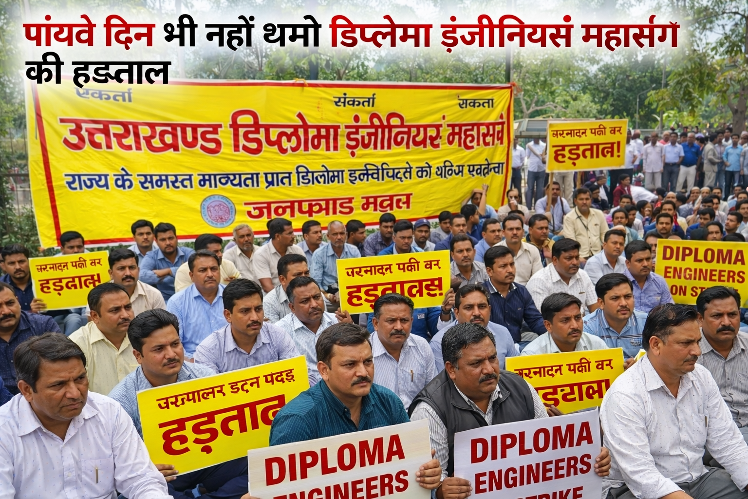 उत्तराखण्ड में डिप्लोमा इंजीनियर्स महासंघ की अनिश्चितकालीन हड़ताल आज पांचवां दिन और अधिक उग्र रूप में जारी रही। हड़ताल के चलते आवश्यक सेवाओं को छोड़कर प्रदेश के अधिकांश निर्माण एवं विकास कार्य पूरी तरह ठप हो गए हैं, जिससे आम जनता भी प्रभावित होने लगी है।