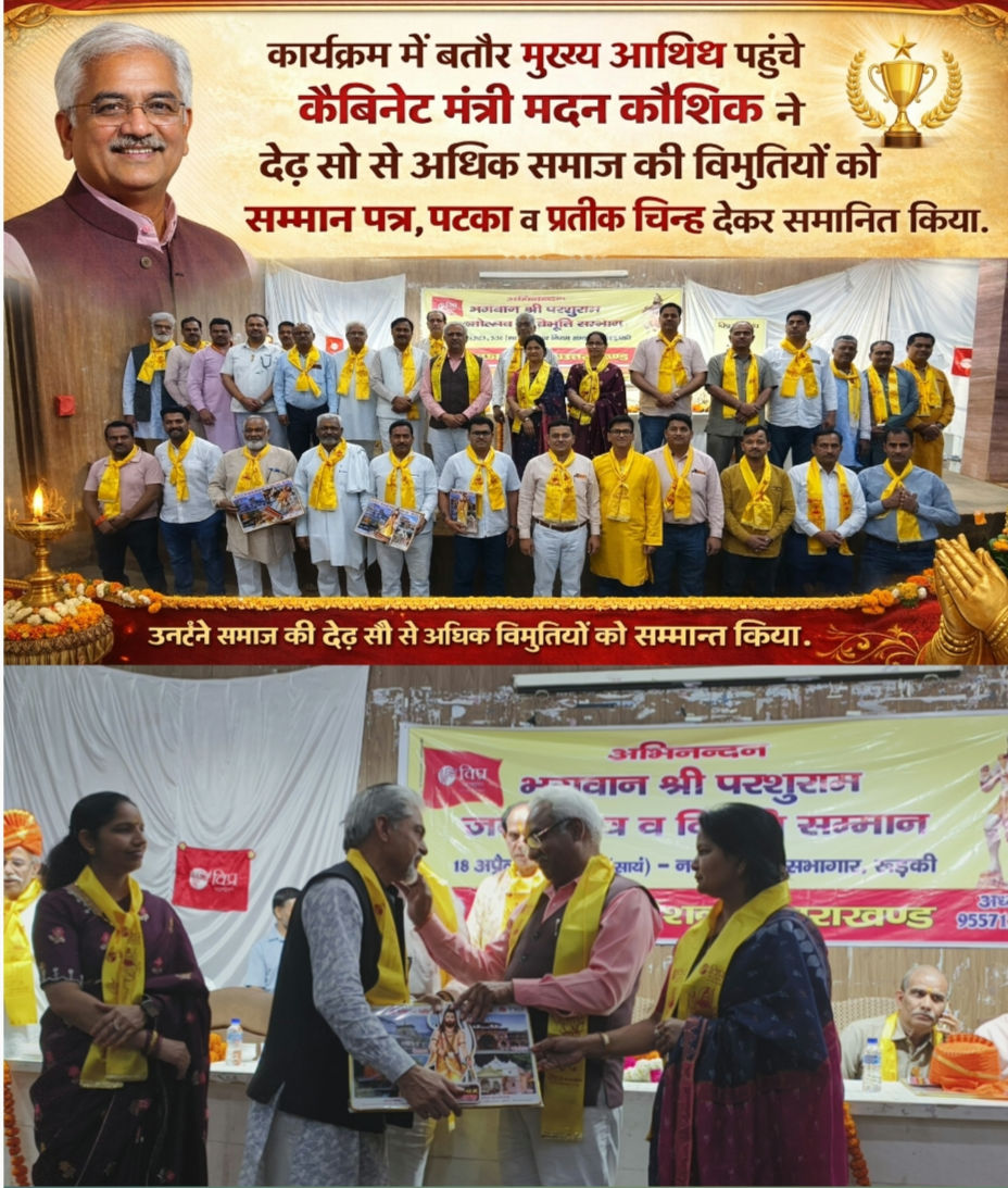 रुड़की।आज विप्र फाउंडेशन की ओर से नगर निगम संभागार में विभूति सम्मान समारोह का आयोजन किया गया। कार्यक्रम में बतौर मुख्य अतिथि पहुंचे कैबिनेट मंत्री मदन कौशिक ने डेढ़ सौ से अधिक समाज की विभूतियों को सम्मान पत्र, पटका व प्रतीक चिन्ह देकर सम्मानित किया।विभूति सम्मान समारोह को बतौर मुख्य अतिथि संबोधित करते हुए कैबिनेट मंत्री मदन कौशिक ने कहा कि समाज की एकजुटता को लेकर विप्र फाउंडेशन संगठन अच्छा कार्य कर रहा है। यह संगठन देश के कई राज्यों में सक्रियता से भूमिका निभा रहा है। इस फाउंडेशन के माध्यम से समाज के वृद्धजन, प्रबुद्ध नागरिक व समाज की प्रतिभाओं को भी सम्मानित कर उनकी हौंसला फजाई की जा रही है। विप्र के क्षेत्रीय अध्यक्ष जितेंद्र भारद्वाज ने 51 हजार की धनराशि भूमि खरीदने के लिए देने की घोषणा की, उन्होंने कहा कि पापियों का अंत करने के लिए परशुराम पैदा हुए थे, उन्होंने कहा कि यदि नीति समाज या लोगो के खिलाफ जाती है, तो मैं उसका खुलकर विरोध करता हूं, उन्होंने कहा कि ब्राह्मण पहले 8-8 जप करता था, लेकिन अब व्यवस्था बदल गई है। उन्होंने तंज कसते हुए कहा कि जब आप दो सो लोगों के हाल को नहीं भर सकते, तो आपकी क्या सुनवाई होगी। जब तक राजा को सर नहीं दिखेंगे, आपको कुछ नहीं मिल सकता, देवभूमि में ब्राह्मण समाज सो चुका है और यूजीसी के गंभीर परिणाम समाज की आने वाली पीढ़ी भुगतेगी। कार्यक्रम का संचालन पवन शर्मा व सुजीत शर्मा संयुक्त रूप से किया। इस दौरान महापौर अनिता देवी अग्रवाल ने भी विप्र फाउंडेशन के प्रयासों को सराहा ओर कहा कि समाज की मजबूती में विप्र फाउंडेशन महती भूमिका निभा रहा है। विप्र फाउंडेशन के प्रदेश अध्यक्ष अश्वनी भारद्वाज ने बताया कि फाउंडेशन द्वारा स्थापना के पांच वर्षों में ब्लड डोनेशन कैंप, जागरूकता शिविर जैसे समाजिक कार्यक्रमों में बढ़ चढ़कर हिस्सेदारी की गई, आज फाउंडेशन ने विभूति सम्मान कार्यक्रम कर समाज के लोगों, प्रतिभाओं को सम्मानित किया। कार्यक्रम का दीप प्रज्वलन के साथ शुभारंभ किया गया। समारोह में जितेंद्र भारद्वाज क्षेत्रीय अध्यक्ष, अभय पांडे, कुलदीप वशिष्ठ, पार्षद नवनीत शर्मा, जेपी शर्मा, प्रीति भारद्वाज, पदम प्रकाश शर्मा, डॉ. गोपाल शर्मा, सौरभ भूषण शर्मा, केपी शर्मा, वैद्य टेक वल्लभ, पार्षद सचिन कश्यप, मनोज कुमार, डॉ. कुलदीप शर्मा, कमल शर्मा, एसपीएस गौतम, आशुतोष पांडे, नरेश गोस्वामी, सुरेश शर्मा, सूरजभान शर्मा, राजकुमार शर्मा, सुजीत शर्मा, पद्म शर्मा, सुखपाल शर्मा, मुकेश शर्मा आदि बड़ी में समाज के जिम्मेदार व गणमान्य लोग मौजूद रहे।