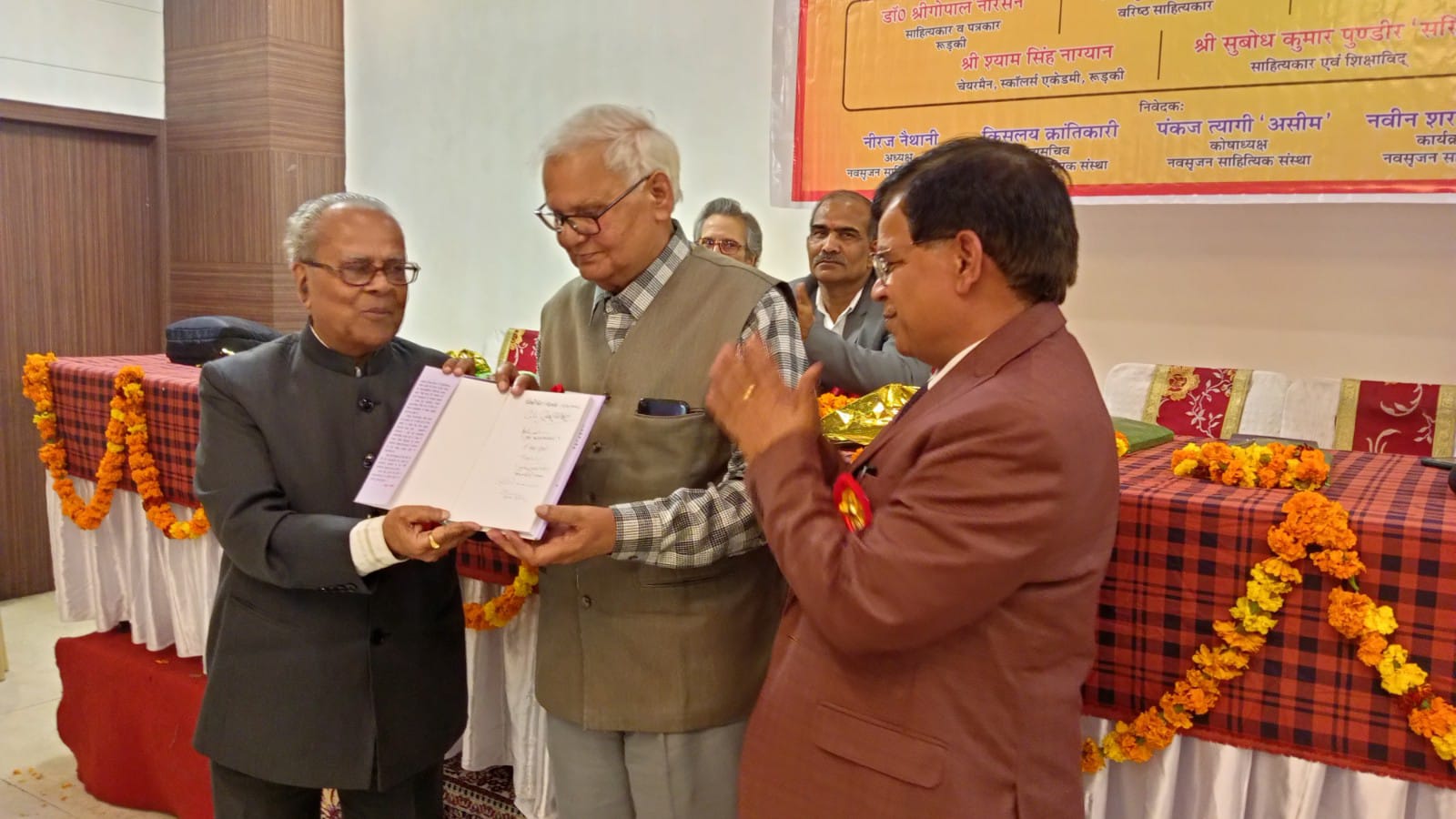 नवसृजन साहित्यिक संस्था (रजि.) रुड़की के स्थापना दिवस की बेला पर आज संस्था के समन्वयक तथा वरिष्ठ साहित्यकार श्री सुरेंद्र कुमार सैनी के गीत संग्रह ” गीत हृदय की धड़कन के” का लोकार्पण होटल दीप रेजिडेंसी रुड़की के सभागार में एक भव्य समारोह में किया गया। इस साहित्यिक आयोजन की अध्यक्षता देश के वरिष्ठ साहित्यकार एवं शिक्षाविद डॉ. योगेंद्र नाथ शर्मा ‘अरुण’ द्वारा की गई तथा मुख्य अतिथि के रूप में मुख्य शिक्षा अधिकारी जनपद पौड़ी डॉ. आनंद भारद्वाज उपस्थित रहे। कार्यक्रम का सधे हुए शब्दों में रोचक ढंग से संचालन संस्था के कोषाध्यक्ष व नवोदित ग़ज़लकार श्री पंकज त्यागी ‘असीम’ ने किया। विशिष्ट अतिथि के रूप में मंच पर सुविख्यात साहित्यकार डॉ. सम्राट सुधा, वरिष्ठ साहित्यकार व पत्रकार डॉ. श्रीगोपाल नारसन, सुप्रसिद्ध ग़ज़लकार व उपन्यासकार श्री कृष्ण सुकुमार, पूर्व प्रधानाचार्य श्री सुबोध कुमार पुंडीर ‘सरित’ एवं स्कॉलर्स एकेडमी रुड़की के चेयरमैन श्री श्याम सिंह नागयान विराजमान रहे।