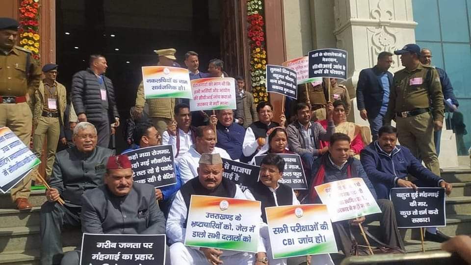 गैरसैण। सोमवार को सत्र शुरू होने से पहले कांग्रेसी विधायकों ने विधानसभा परिसर में धरना दिया। इस दौरान उन्‍होंने भर्ती घोटाले, महंगाई सहित अन्य मांगों को लेकर नारेबाजी की। इस दौरान मुख्‍यमंत्री पुष्‍कर सिंह धामी विधायकों के पास पहुंचे और बातचीत कर उन्‍हें सदन में जाने के लिए मनाया। वहीं विधानसभा सत्र के पहले ही दिन अपनी विभिन्‍न मांगों को लेकर कांग्रेस ने विधानसभा मार्च किया, लेकिन पुलिस ने प्रदर्शनकारियों को जंगलचट्टी मालसी में ही रोक दिया। प्रदर्शनकारियों के साथ पूर्व सीएम हरीश रावत भी मौजूद रहे।
