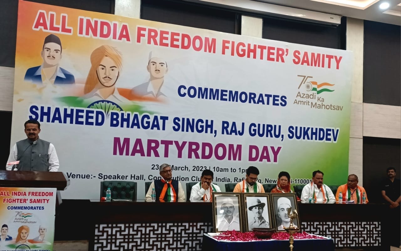 नई दिल्ली, दिनांक 23 मार्च 2023 को स्पीकर हाल कांस्टीट्यूशनल क्लब रफी मार्ग नई दिल्ली में शहीद भगत सिंह, राजगुरु एवं सुखदेव के बलिदान दिवस पर एक पावन स्मरण /श्रद्धांजलि सभा का आयोजन अखिल भारतीय स्वतंत्रता सेनानी संगठन (रजि.), स्वतंत्रता सेनानी उत्तराधिकारी परिवार समिति (रजि.) तथा शहीद स्मृति चेतना समिति के संयुक्त तत्वावधान में आयोजित किया गया। कार्यक्रम में मुख्य अतिथि के रूप में श्री अनुराग सिंह ठाकुर सूचना प्रसारण मंत्री भारत सरकार उपस्थित हुए तथा विशिष्ट अतिथि के रूप में श्री अजय कुमार मिश्रा, गृह राज्यमंत्री स्वतंत्रता सेनानी प्रभाग, श्री जगदंबिका पाल, सांसद लोकसभा, श्रीमती माला राज्यलक्ष्मी राजमाता सांसद लोकसभा की गरिमामयी उपस्थिति रही। कार्यक्रम की शुरुआत राष्ट्रगीत वन्देमातरम से की गई तत्पश्चात सभी अतिथियों तथा आगंतुकों द्वारा तीनों शहीदों भगत सिंह, राजगुरु तथा सुखदेव के साथ ही अखिल भारतीय स्वतंत्रता सेनानी समिति के पूर्व अध्यक्ष स्व. श्री एन.आर. मथाड, स्व. श्री कृष्ण कांत लहकर, कोषाध्यक्ष स्व. श्री विक्रम चोपड़ा एवं शहीद स्मृति चेतना समिति के संस्थापक स्व. श्री रवि चंद्र गुप्ता के चित्रों पर भी पुष्पांजलि अर्पित की गई। इस अवसर पर स्वतंत्रता आंदोलन में भाग लेने वाले स्वतंत्रता संग्राम सेनानियों तथा शहीदों का स्मरण करके उन्हें भी अपनी श्रद्धांजलियां अर्पित की गईं।स्वतंत्रता सेनानी संगठन के राष्ट्रीय महासचिव श्री जितेन्द्र रघुवंशी ने अपने उद्बोधन में कहा कि देशभर के लगभग 40 से अधिक स्वतंत्रता सेनानियों के संगठन मिलकर अपने स्वतंत्रता सेनानियों और शहीदों की स्मृति में प्रत्येक माह के प्रथम रविवार को 10 बजे 10 मिनट शहीदों के नाम कार्यक्रम चला रहे हैं, जिसमें भारी संख्या में लोग एकत्रित होकर प्रत्येक माह के प्रथम रविवार को अपने स्वतंत्रता सेनानियों /शहीदों को श्रद्धा सुमन अर्पित करते हैं। उन्होंने यह भी बताया कि देश भर में स्वतंत्रता सेनानियों के संगठन अपने स्तर पर प्रत्येक स्वतंत्रता सेनानी/ शहीदों के स्मारकों तथा जन्म स्थान पर जाकर उनकी पद रज एकत्रित कर रहे हैं, जिसको जनपदवार कलशों में संग्रहीत किया जा रहा है। उन्होंने देश भर में जनपदवार स्वतंत्रता संग्राम सेनानियों/ शहीदों के फोटो सहित स्मारिकाओं को प्रकाशित कराने की भी जानकारी दी। श्री जितेन्द्र रघुवंशी ने बोलते हुए इस बात पर आक्रोश जाहिर किया कि देश भर के स्वतंत्रता सेनानियों के संगठनों ने कई बार भारत सरकार को प्रतिवेदन देकर दिल्ली में एक *राष्ट्रीय स्वतंत्रता संग्राम सेनानी मेमोरियल* बनाने की मांग की गई, लेकिन आज तक भी केन्द्र सरकार ने उदासीनता ही दिखाई है। अब देशभर के स्वतंत्रता सेनानियो