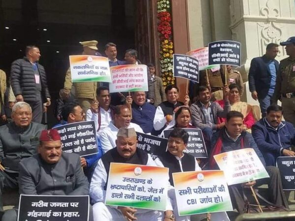गैरसैण। सोमवार को सत्र शुरू होने से पहले कांग्रेसी विधायकों ने विधानसभा परिसर में धरना दिया। इस दौरान उन्होंने भर्ती घोटाले, महंगाई सहित अन्य मांगों को लेकर नारेबाजी की। इस