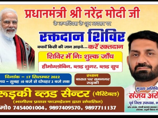 रक्तदान महादान* माननीय प्रधानमंत्री श्री नरेंद्र मोदी जी के जन्मदिवस के उपलक्ष में दिनांक 17 सितंबर 2022 दिन शनिवार को रक्तदान शिविर का आयोजन किया जा रहा है, आप सभी